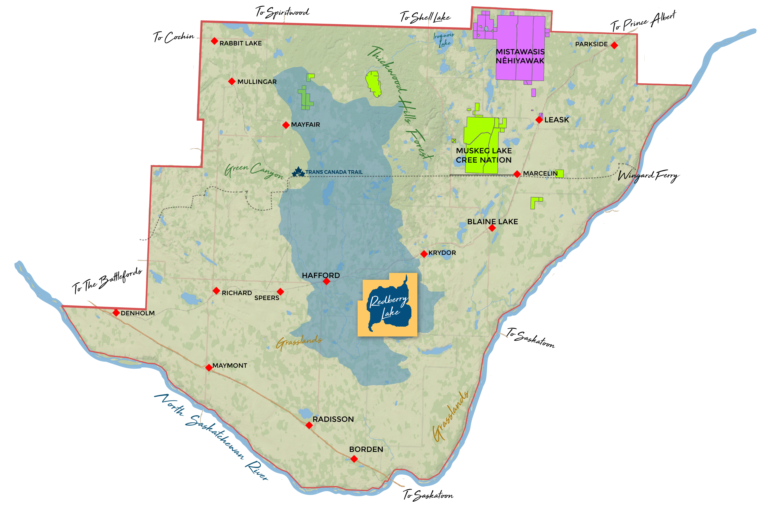 Located on the edge of the Aspen Parkland in Saskatchewan, Canada, the RLBR sits in the central northwest corner of the province. It includes the entire Redberry Lake watershed and its borders which touch several municipalities and small communities. It encompasses Treaty 6 Territory, the traditional territories of the Cree Peoples- Mistawasis Nêhiyawak, Muskeg Lake Cree Nation, Lucky Man Cree Nation and the homelands of the Métis Nation– Western Region 2 and 2A. The town of Hafford is the gateway to the biosphere region.